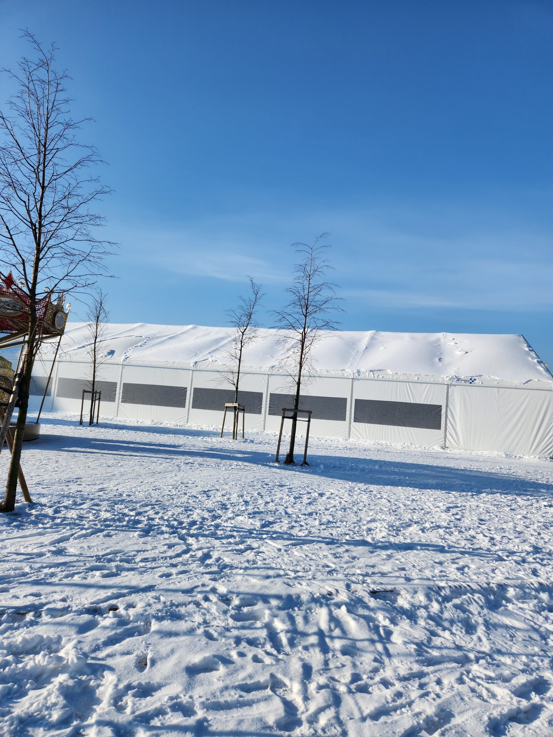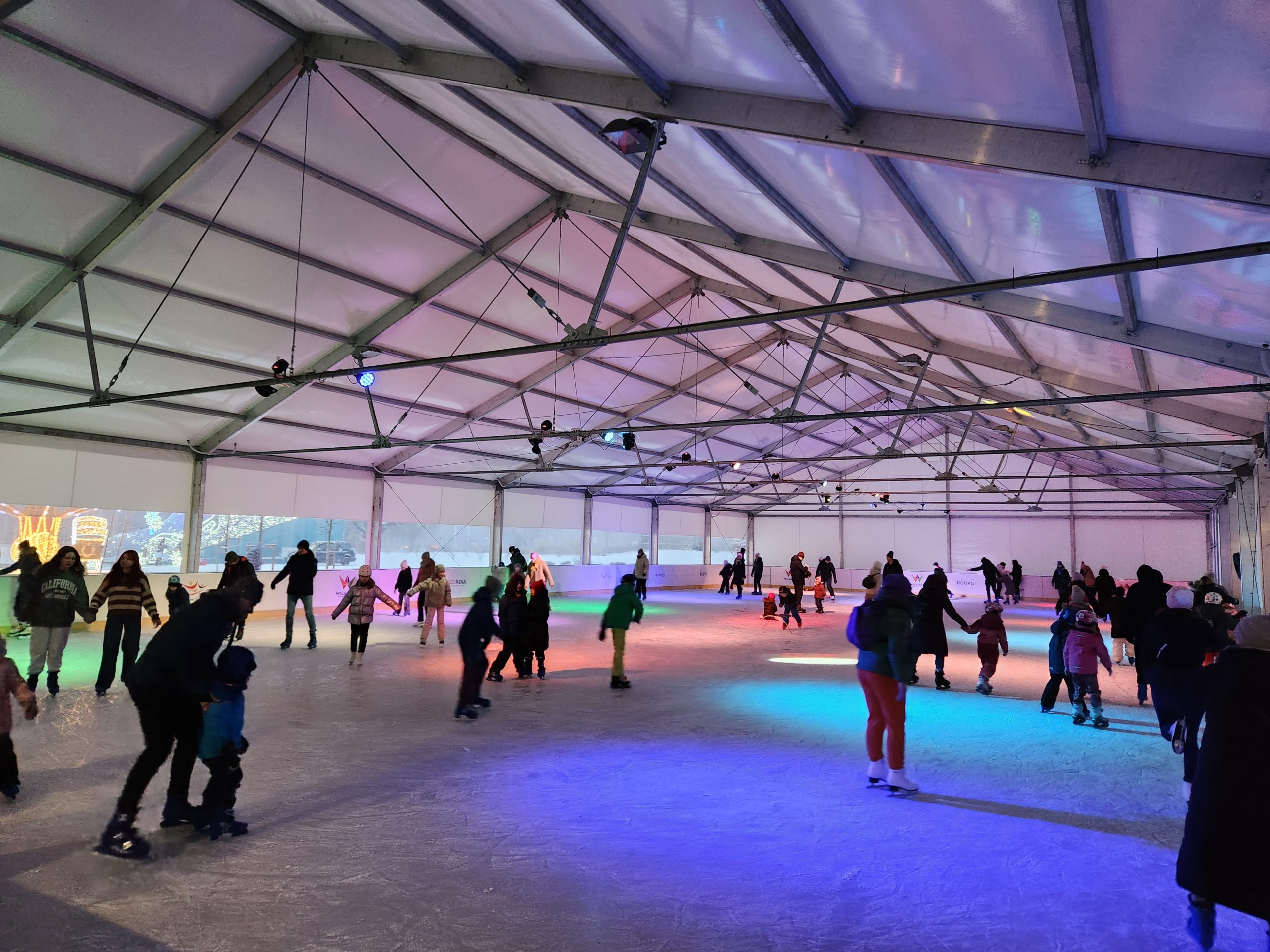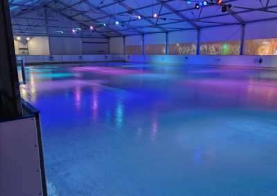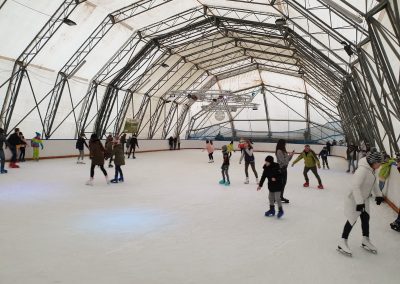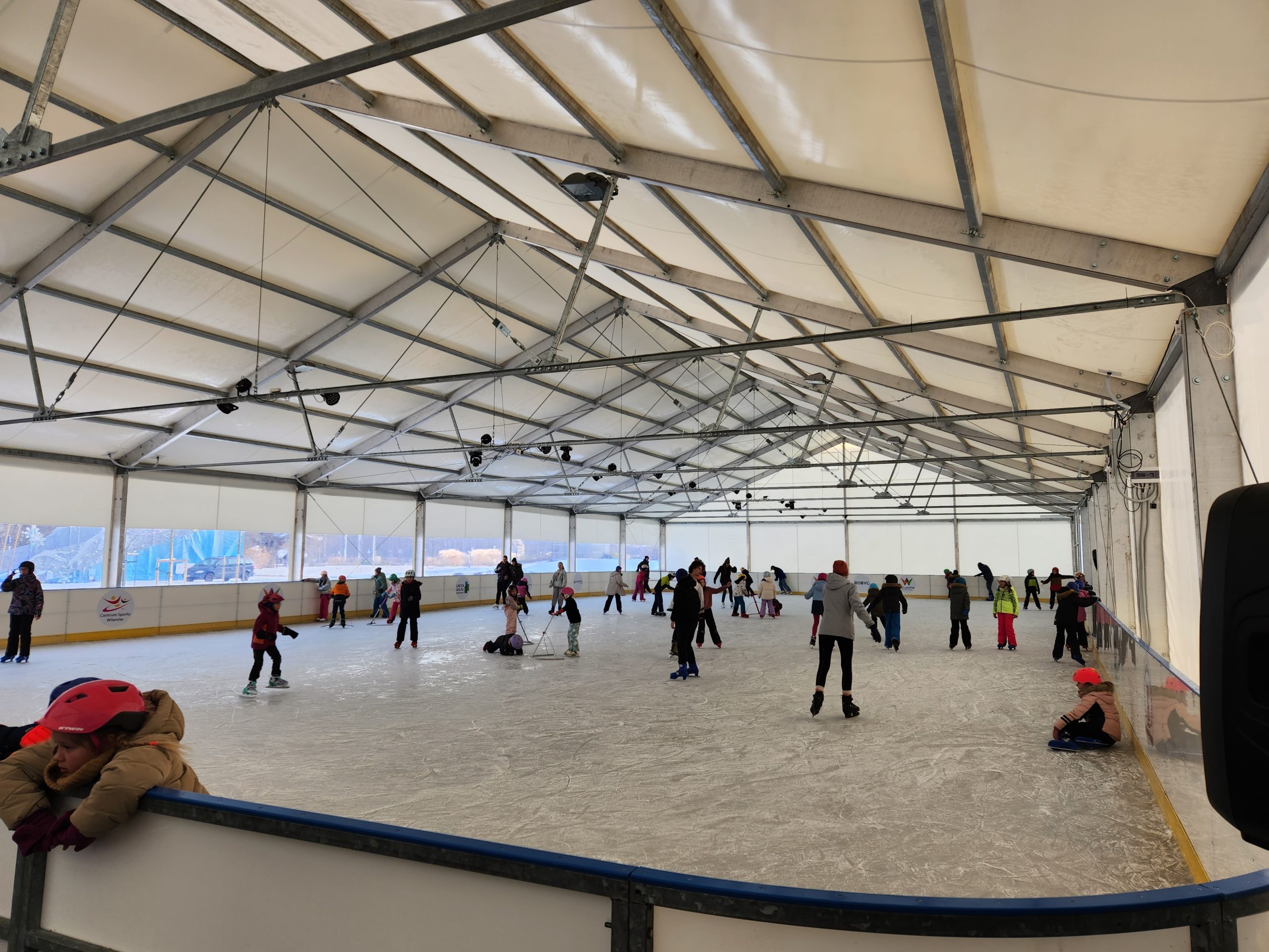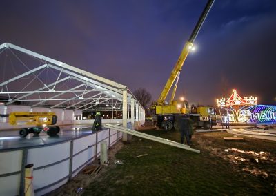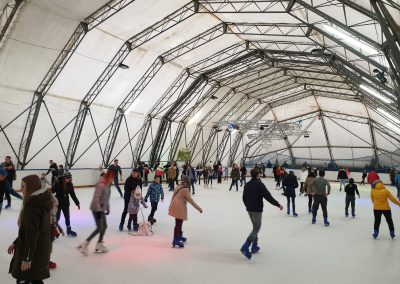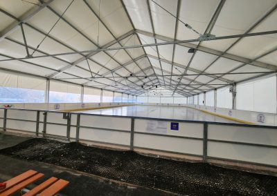 Konstrukcje hal namiotowych, pełniących funkcję zadaszenia lodowisk, są oparte na specjalnie wzmocnionych profilach aluminiowych, co nadaje im podwyższoną odporność na warunki atmosferyczne zimy.